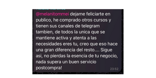 Acceso a un grupo de Telegram: Donde respondo dudas de lunes a viernes. Networking con emprendedoras de tu nicho: Conecta con coaches, terapeutas y mentoras que entienden tus desafíos.
